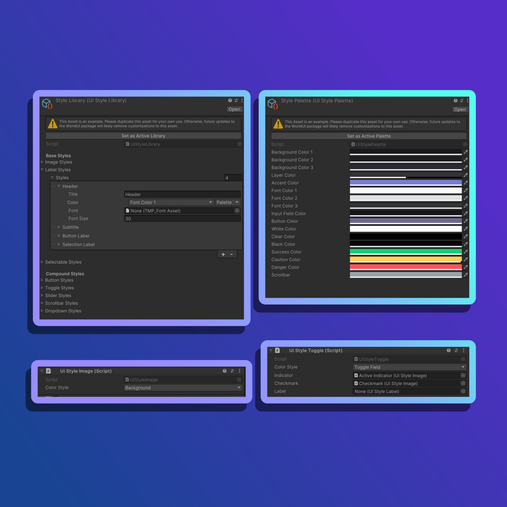 WuiStyle is the theming tool that powers the WorldUI Menu! Making full use of Unity's Editor tools, this system lets you write custom style rules and apply them to Images, Labels, and Selectables (Buttons, Sliders, etc). Changing colors can be done in seconds and apply to the both the scenes and prefabs that you're using. For further information, read the documentation linked above!